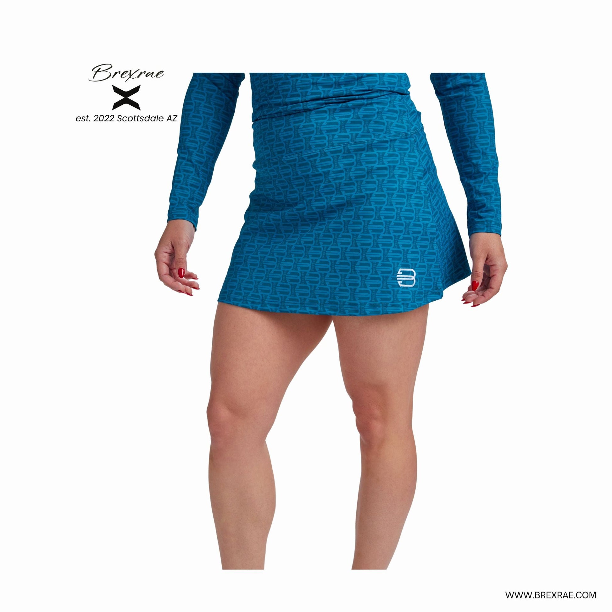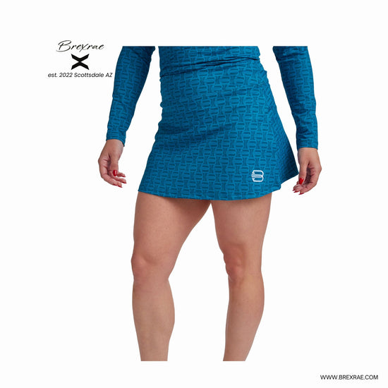 Add a vibrant touch to your activewear with the Brexrae X-Signature Aqua High Skort, a women’s 13-inch skort designed for performance and style. This high-waisted skort features a bold aqua base with Brexrae’s signature logo pattern, matching the design of our X-Signature Aqua Long Sleeve, and reflecting Brexrae’s Scottsdale, AZ heritage since 2022. Crafted with a stretchy, breathable fabric, it offers a flattering fit and freedom of movement, making it ideal for golf, pickleball, tennis, or casual outings. The high-waisted design provides added coverage and comfort, while the iconic Brexrae "X" branding adds a modern touch. Pair it with the matching Brexrae long sleeve for a coordinated look that’s both functional and fashion-forward.