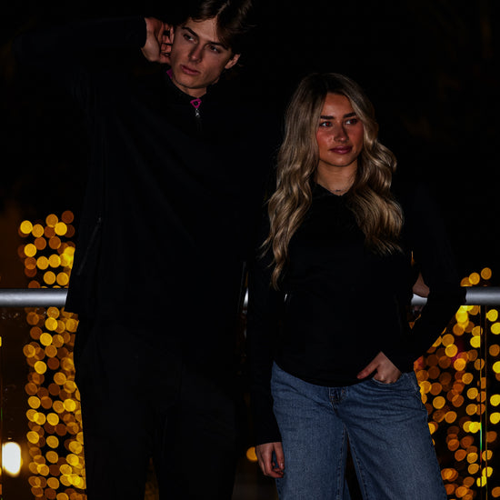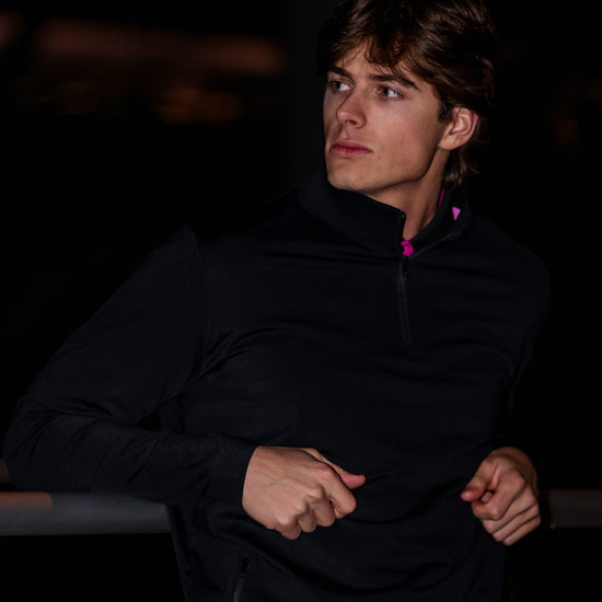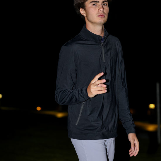 Engineered from premium nylon and spandex blend, this three-quarter zip delivers lightweight performance without compromising durability. The streamlined design moves with you, while strategically placed side pockets provide convenient storage for essentials—whether you're warming your hands or securing personal items. Perfect for layering or standalone wear, this Black staple transitions seamlessly from active pursuits to everyday comfort.