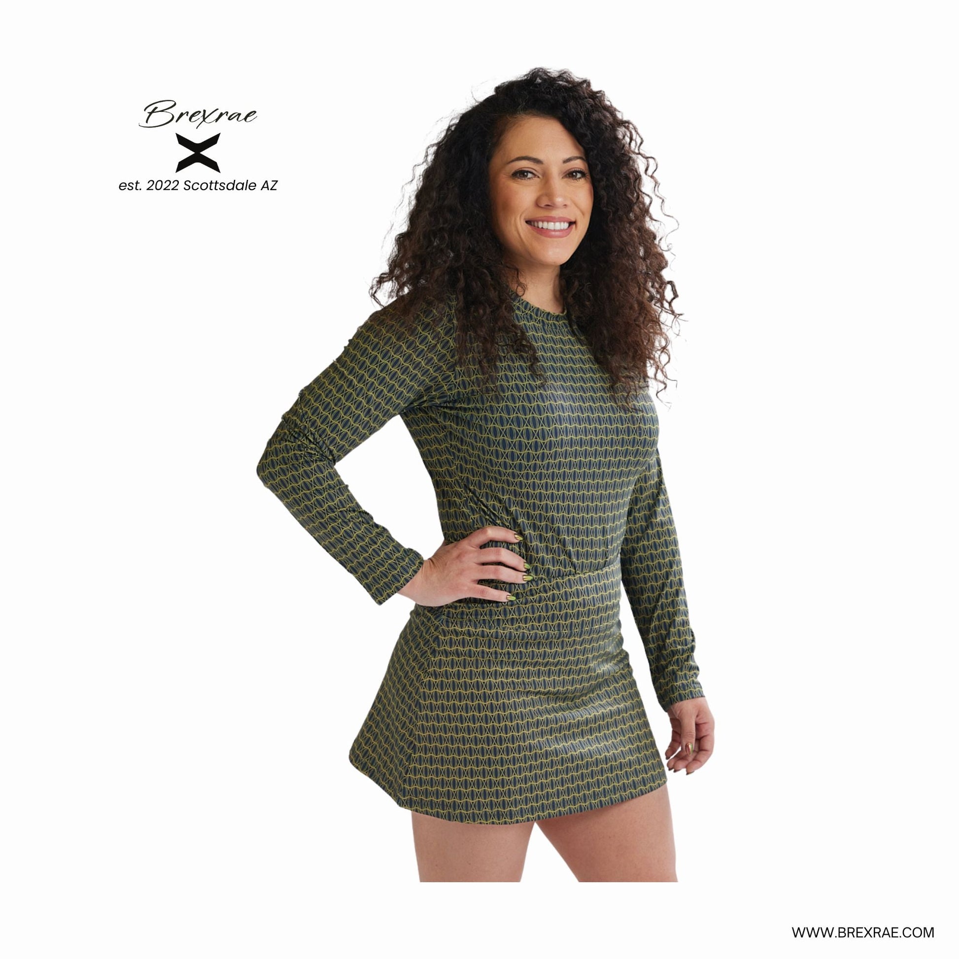 Elevate your activewear with the Brexrae X-Geo Black Gold Long Sleeve, a women’s performance top that blends bold design with functionality. This long-sleeve top features a sleek black base with a unique geometric pattern accented by gold lines, matching the design of our X-Geo Black Gold High Skort, and reflecting Brexrae’s Scottsdale, AZ heritage since 2022. Note that the black and gold colorway may sometimes appear green in certain lighting, adding to its versatile appeal. Crafted with a stretchy, breathable fabric, it offers a comfortable fit that moves with you, making it ideal for golf, pickleball, tennis, or casual outings. The sleek mock-neck design and the iconic Brexrae "X" branding add a modern touch to this eye-catching piece. Pair it with the matching Brexrae skort for a coordinated look that’s both stylish and performance-ready.
