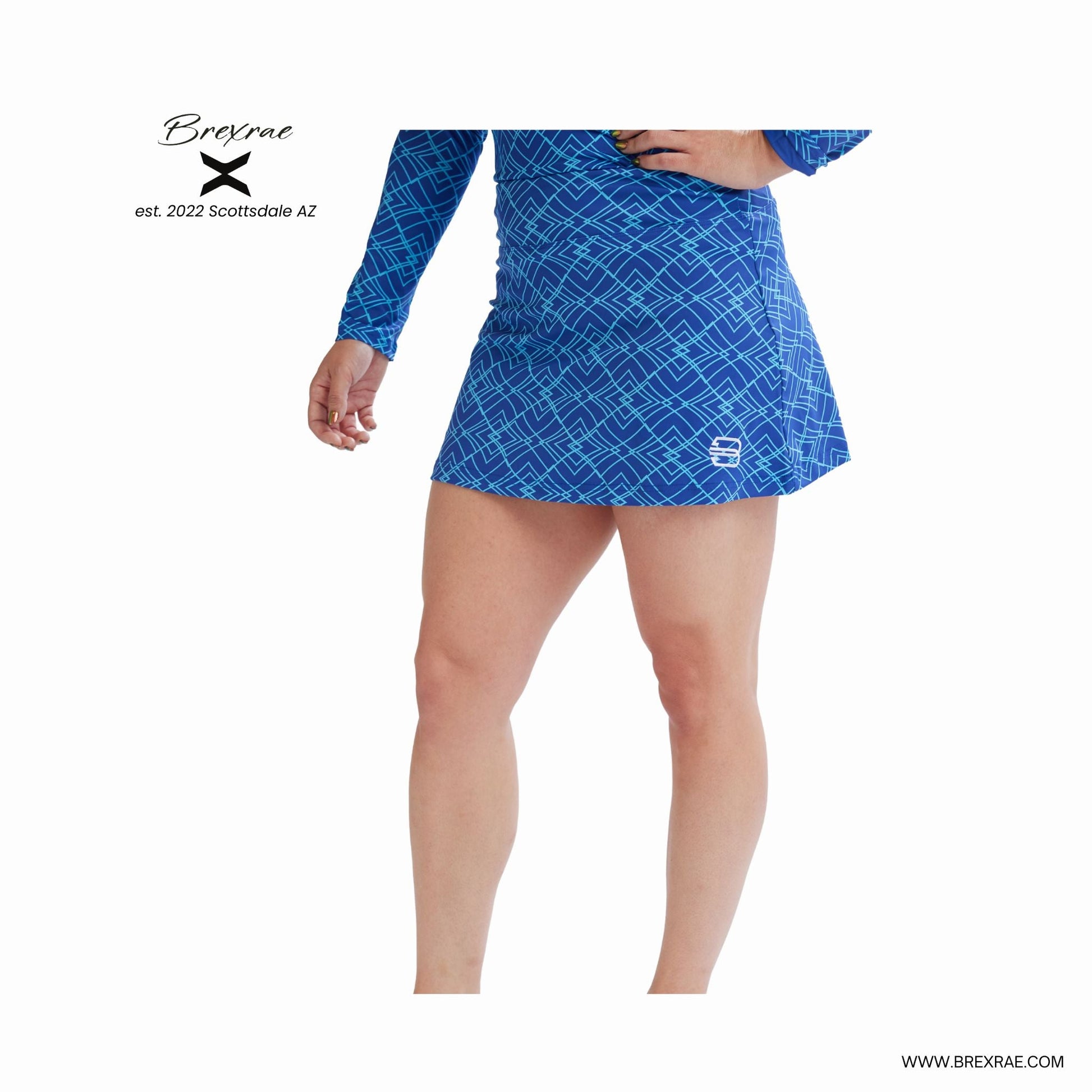 Add a vibrant touch to your activewear with the Brexrae X-Geo Blue High Skort, a women’s 13-inch skort designed for performance and style. This high-waisted skort features a bold blue base with a unique geometric pattern accented by lighter blue lines, matching the design of our popular X-Geo Pink High Skort, and reflecting Brexrae’s Scottsdale, AZ heritage since 2022. Crafted with a stretchy, breathable fabric, it offers a flattering fit and freedom of movement, making it ideal for golf, pickleball, tennis, or casual outings. The high-waisted design provides added coverage and comfort, while the iconic Brexrae "X" branding adds a modern touch. Pair it with the matching Brexrae long sleeve for a coordinated look that’s both functional and fashion-forward.